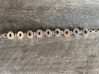 Adjustable with 2 length options and fastens with a distinctive circular T bar clasp. Total length is 7 1/2 inches