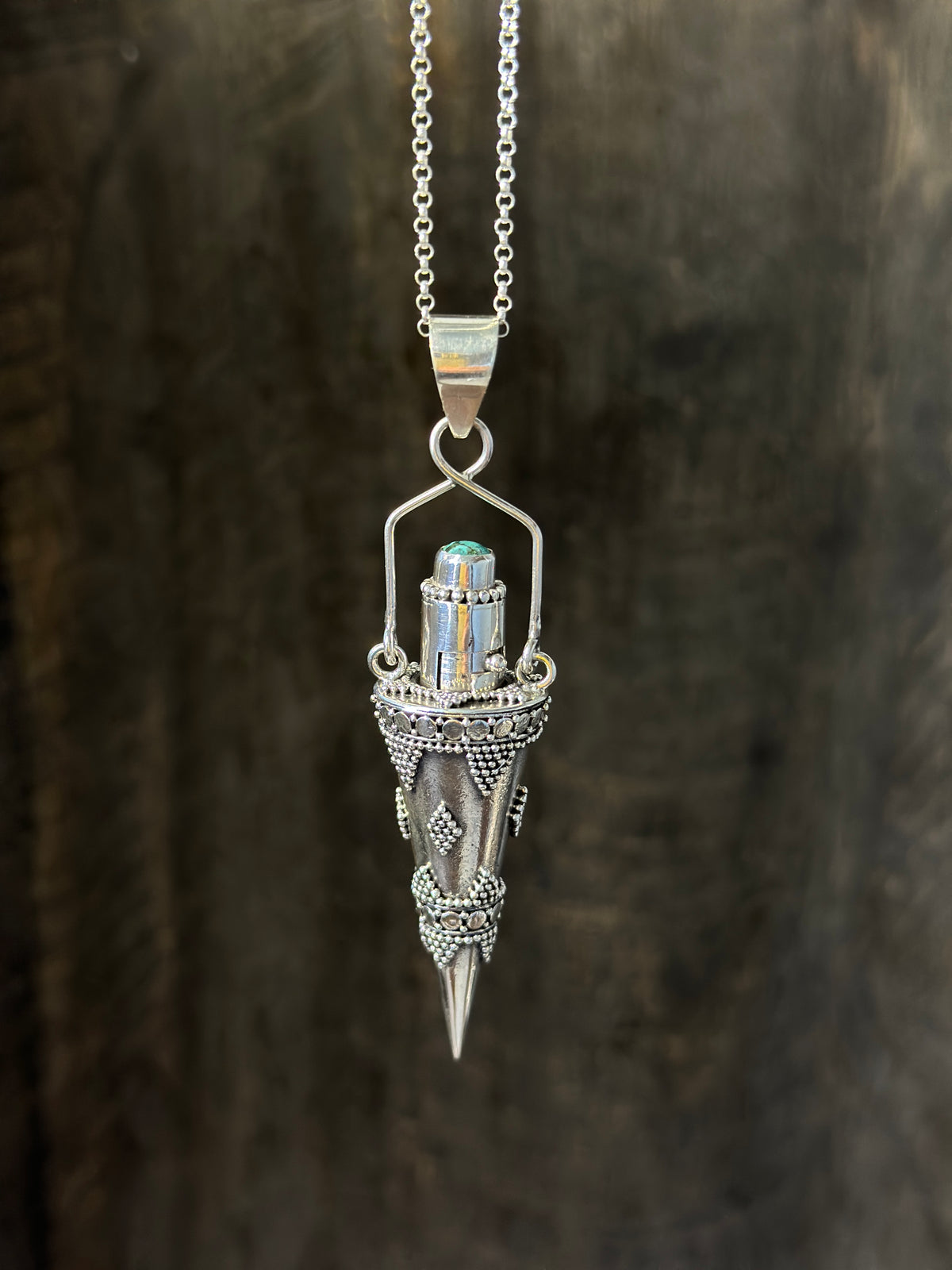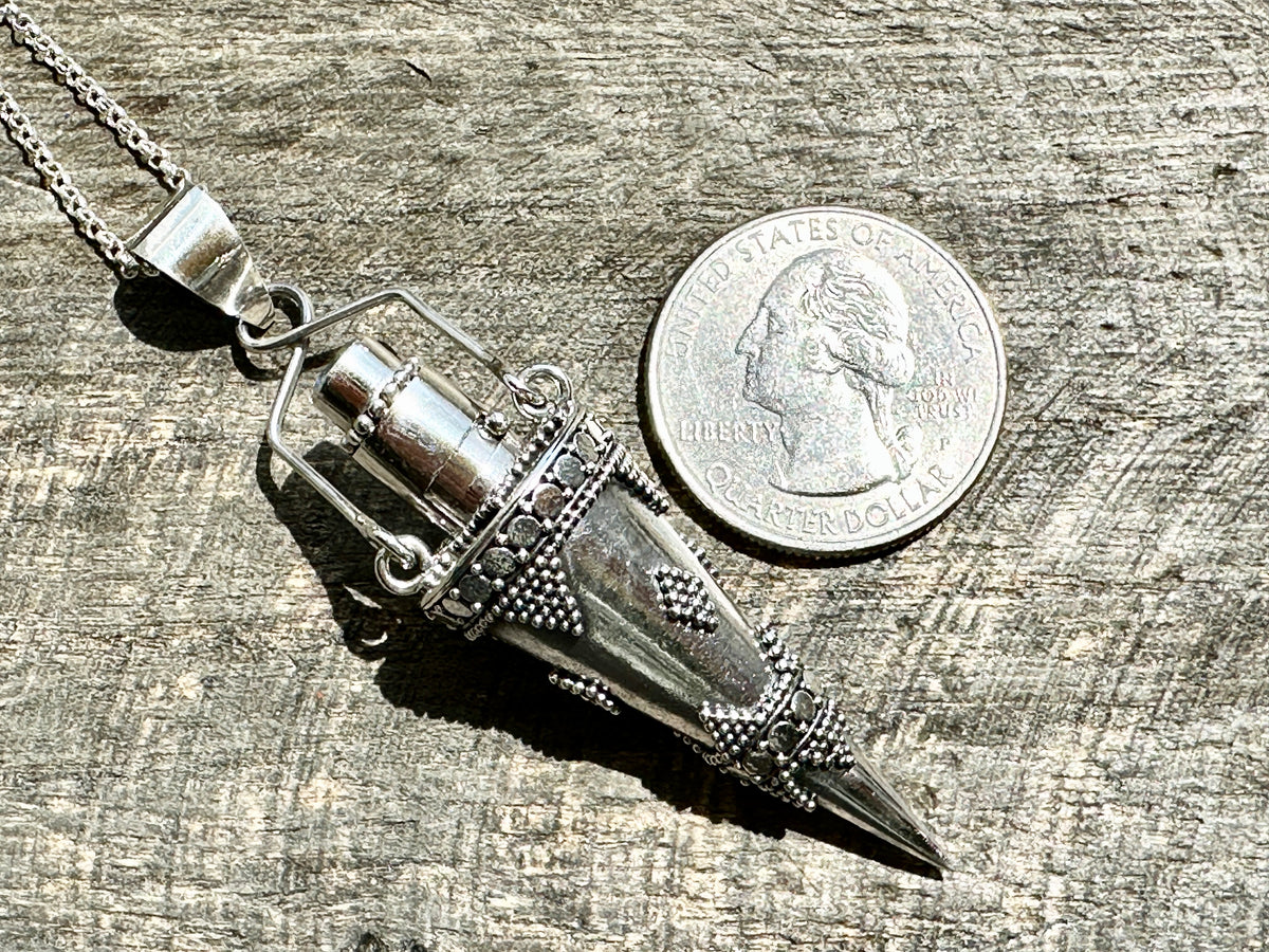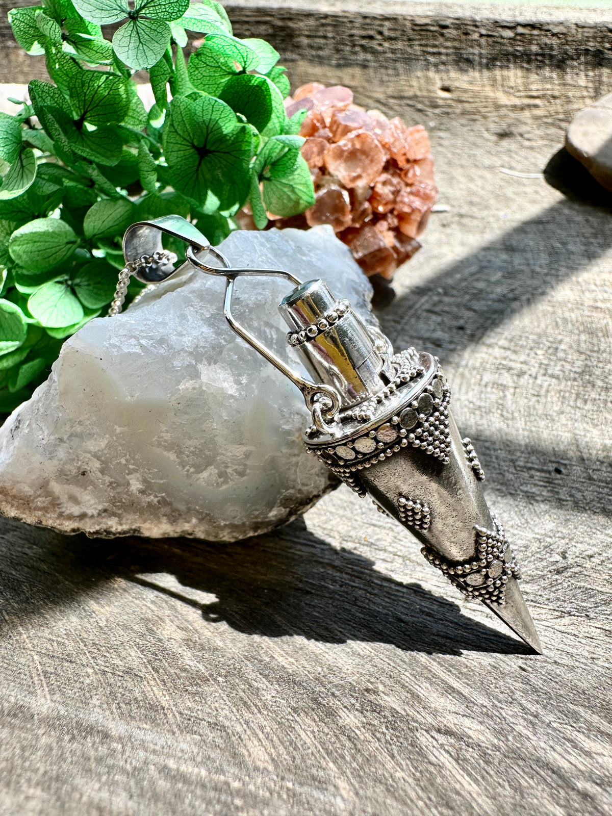 Crafted with the finest quality materials, including a solid silver delicate yet sturdy 18" chain and a vial that securely holds your chosen materials, this pendulum necklace is not only beautiful but also practical. The pendulum is carefully designed to help you access your inner wisdom and intuition, making it perfect for anyone who enjoys divination practices or spiritual rituals.