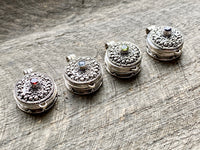 Locket Keepsake Pendants! These Lockets hold small amounts of anything you cherish. Fill with Sand from a Beach vacation, Perfume scent, Ashes of loves ones or pets, a wish or a prayer written on paper, dried flowers, a lock of hair…the possibilities are endless!