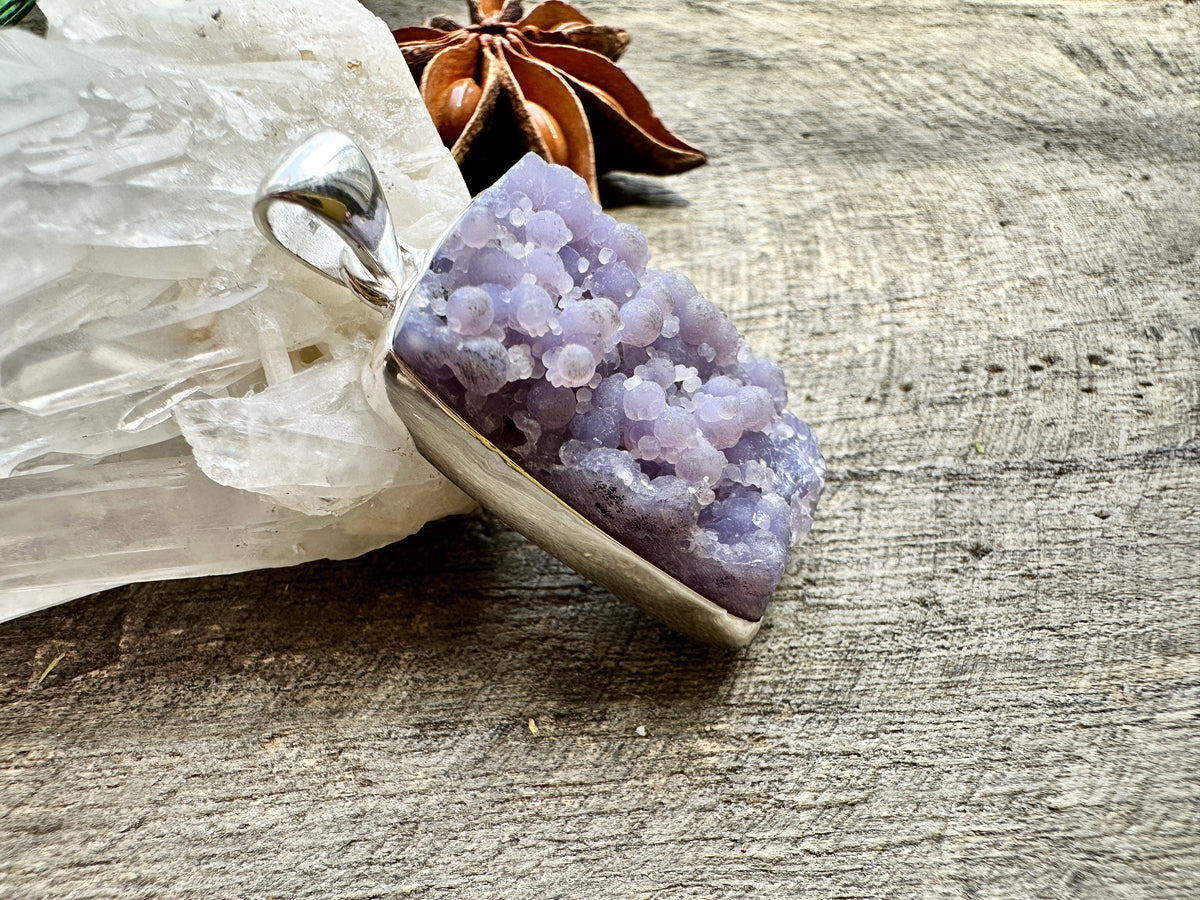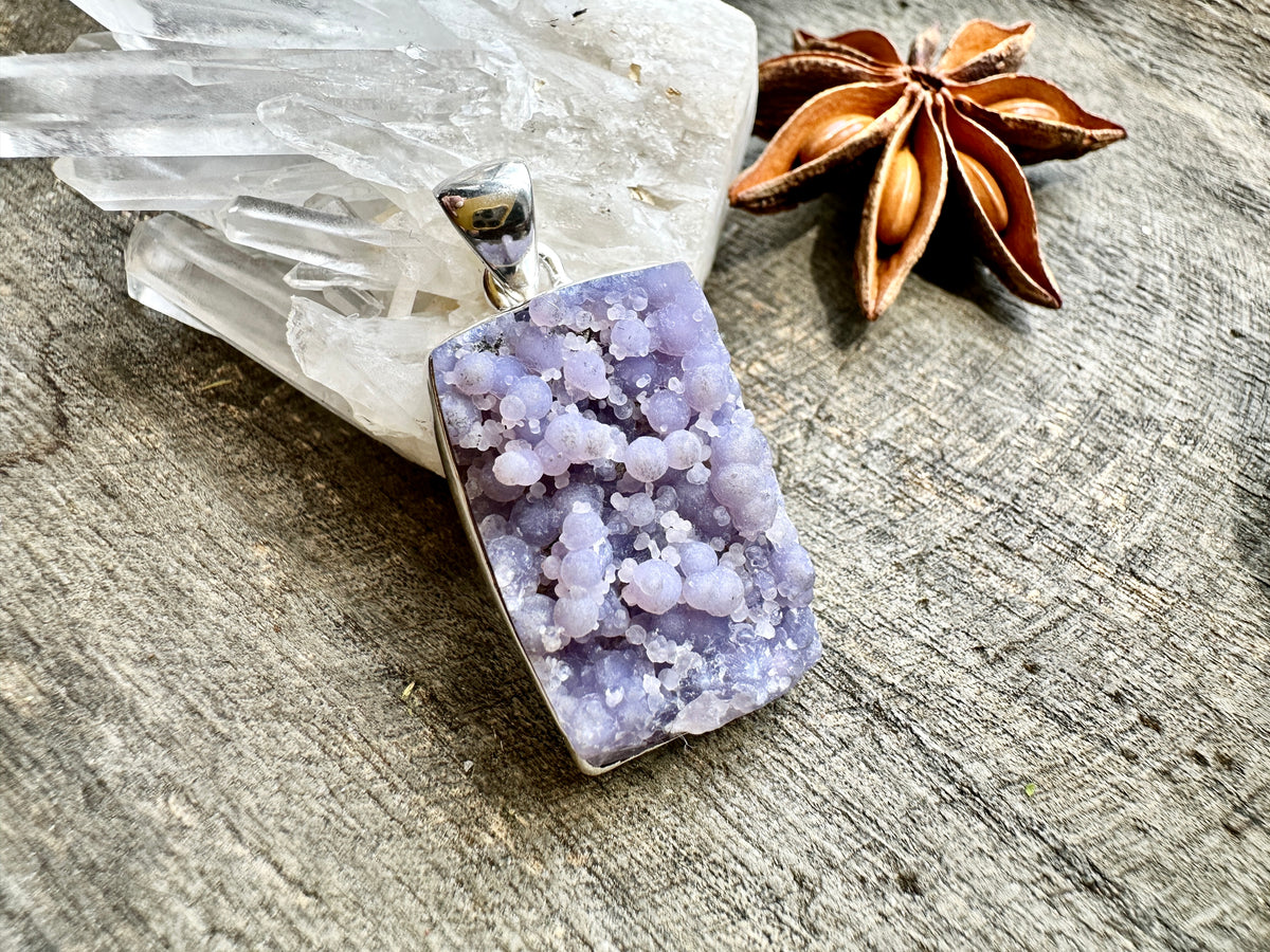 Grace your neckline with the Vineyard Symphony pendant, and let the soothing energy of grape agate transport you to idyllic vineyards, as you celebrate the union of nature's splendor and exquisite craftsmanship. Whether it's a cherished addition to your collection or a thoughtful gift for a loved one, this pendant embodies the essence of nature's beauty and the artistry of skilled hands, making it a truly remarkable treasure.