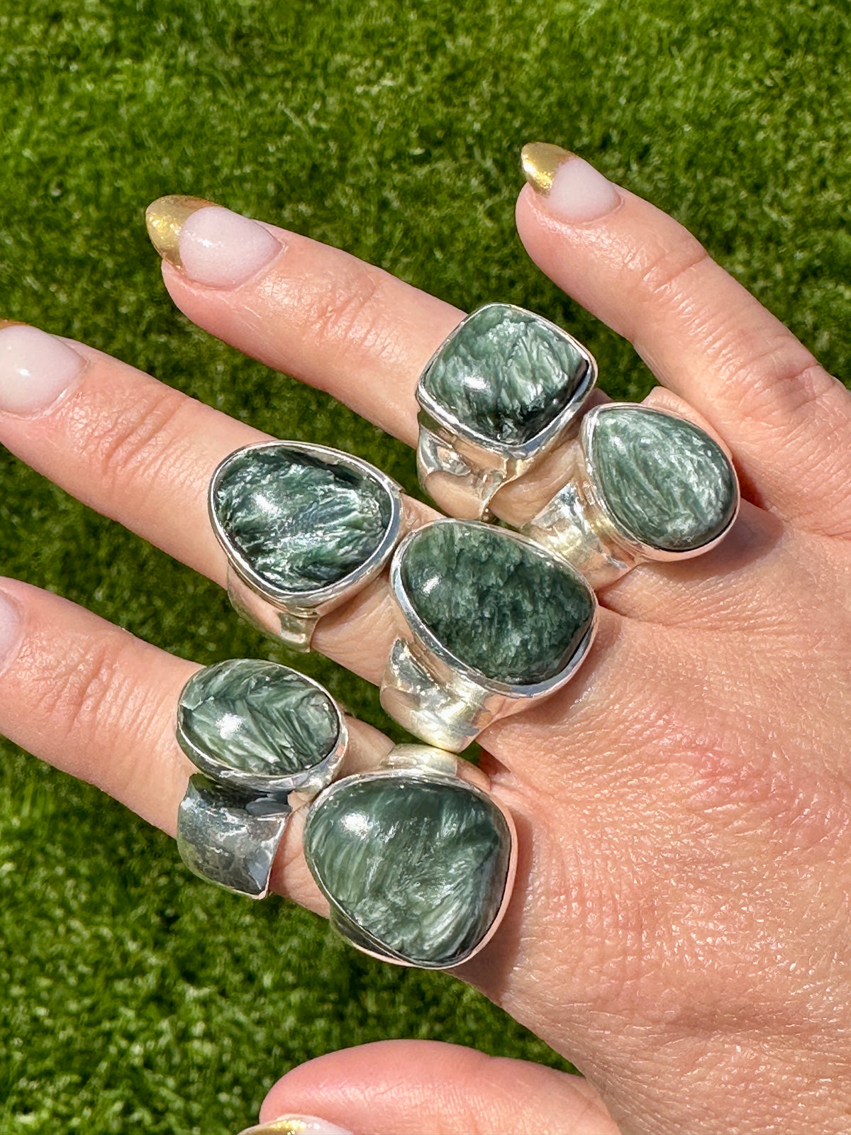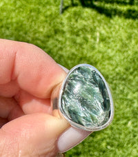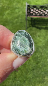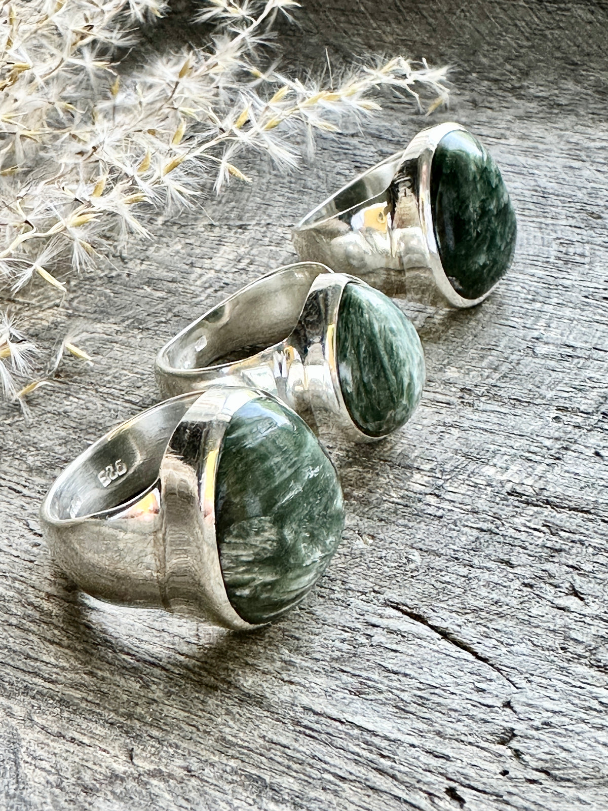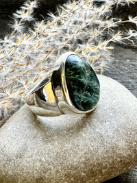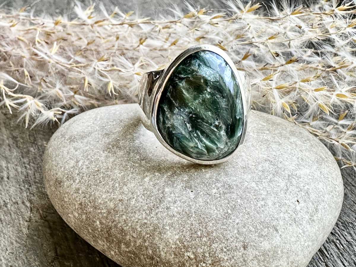 Introducing the Enlightened Seraphinite Ring, a mesmerizing piece crafted with utmost precision and artistry. Made with genuine Seraphinite, known for its ethereal green hues and captivating patterns, this ring radiates a heavenly brilliance that will illuminate your path with its mystical charm.