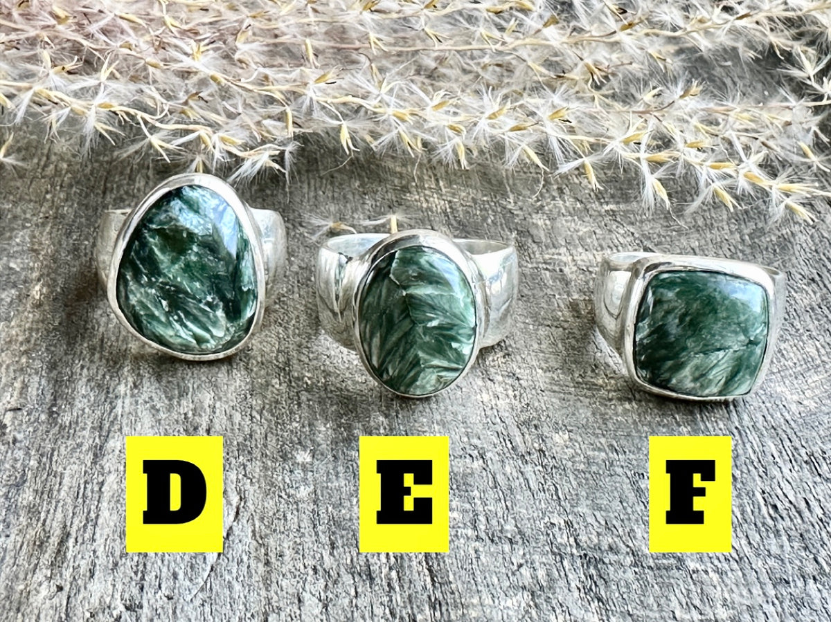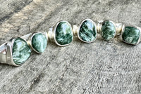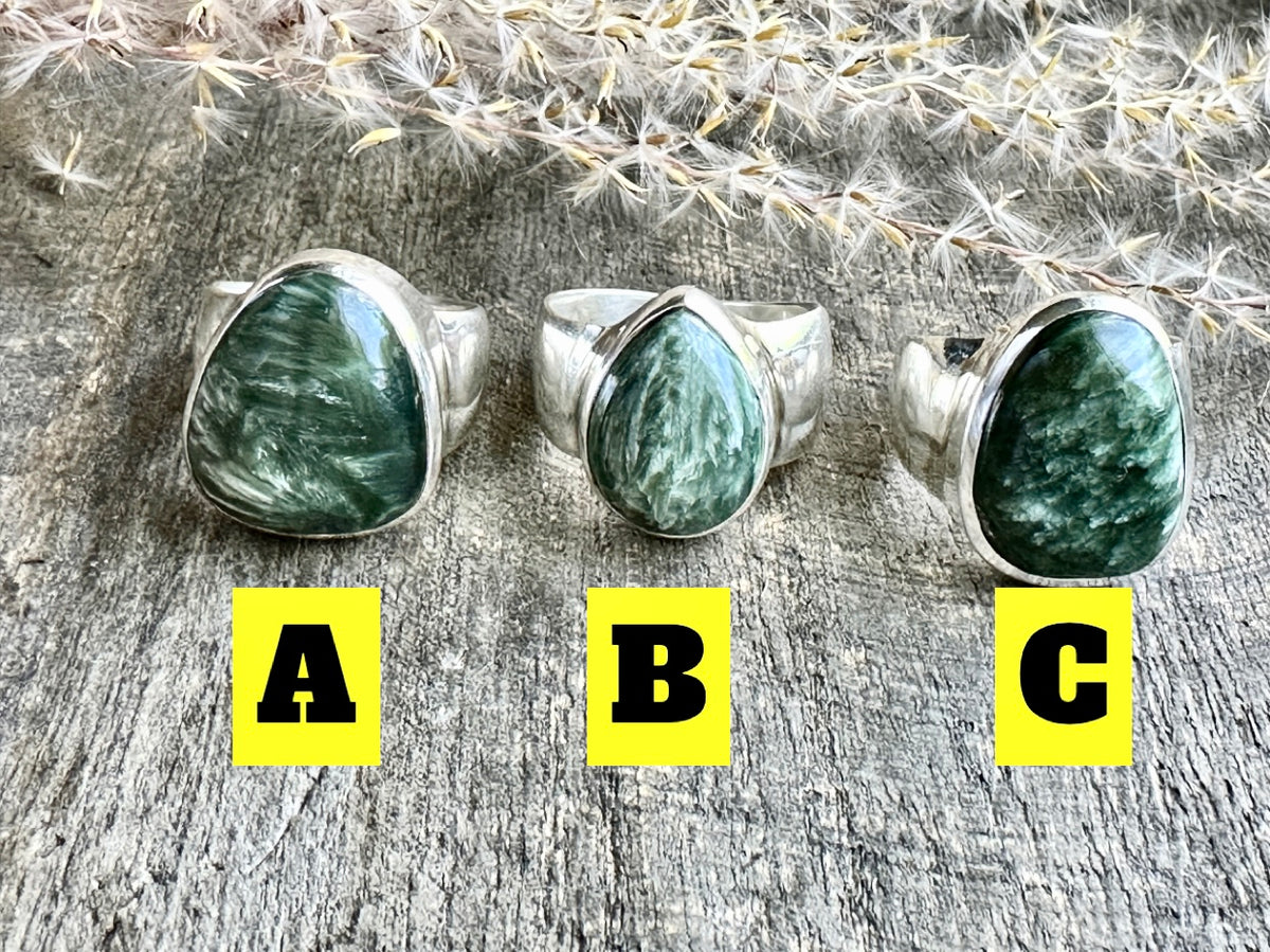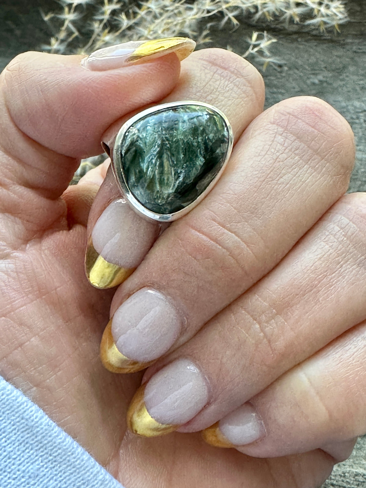 Introducing the Enlightened Seraphinite Ring, a mesmerizing piece crafted with utmost precision and artistry. Made with genuine Seraphinite, known for its ethereal green hues and captivating patterns, this ring radiates a heavenly brilliance that will illuminate your path with its mystical charm.